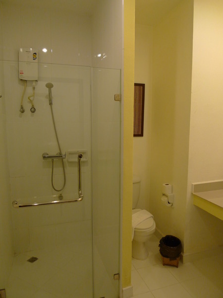 吃飽了,錢也花光了,散步回家,逛逛飯店的設備,愛玩的小花在健身器材區騎了只適合身高180以上使用的腳踏車健身器,但是腳太短跨不上去,腳盤被生鏽的螺絲釘割傷,今晚的不幸再添一樁,沒錢,又有傷兵,還是早點回房睡覺比較安全。