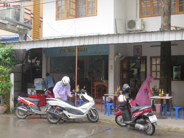 看看時間,已經九點了,我們還沒吃晚餐,拿著僅有的130元泰幣,先買瓶礦泉水止渴,再到接送小姐推薦的丁字路口小吃店,點餐之前先問好價錢~~每道都是35泰銖,我們可以點三種:炒飯、炒雞肉飯都很好吃,豬肉麵疙瘩很普通,付帳時準備剛剛好105元給老闆,老闆豎起大姆指稱讚我們很棒,哈哈!真是小看了台灣人的數學能力。(由於天色暗淡,而且實在太餓,所以晚餐都沒照片,隔天一早經過補拍店面)