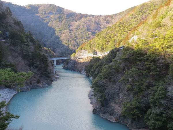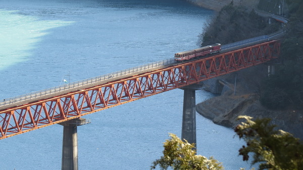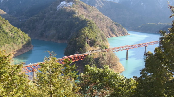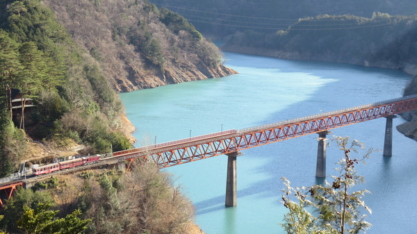 Abt列車駛離奧大井湖上駅~~接岨湖(右),長島水庫(左)。