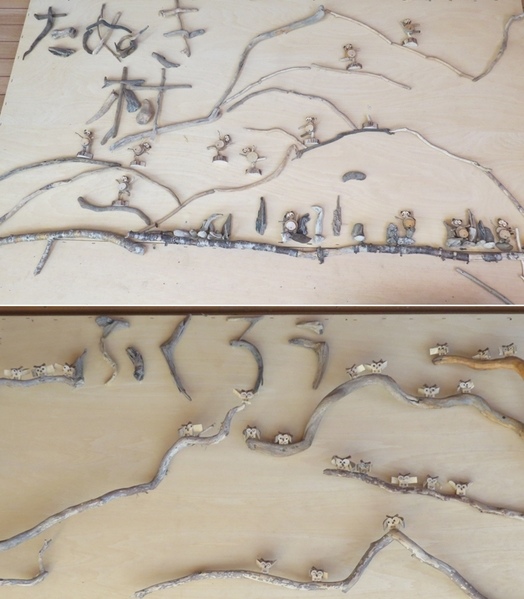 候車室牆上是一大片可愛的貓頭鷹木頭壁貼