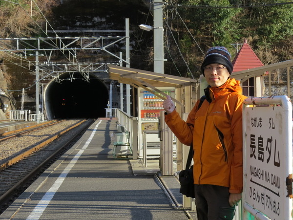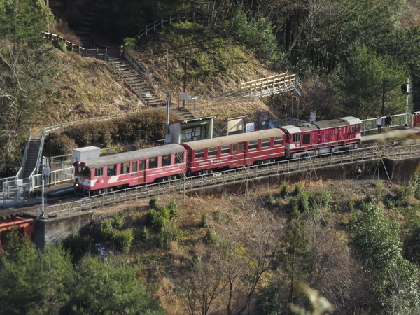 列車停在「奧大井湖上駅」,原本要開車到車站附近,但是道路積雪,遠遠望見一輛小轎車打滑卡在路上,我們引以為戒,還是在展望台遠望就好了。