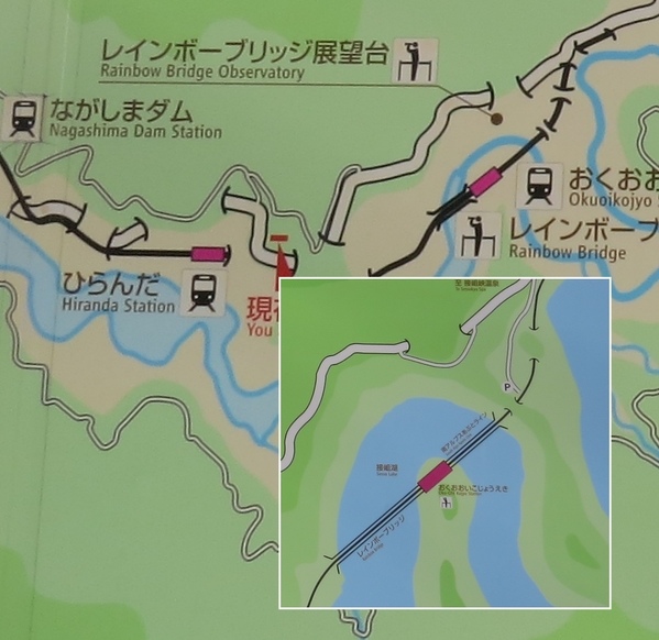 於是就在水庫前的「Abt市代駅」到「長島水庫駅」1.5公里的路線之間,應用「Abt齒軌鐵道」的設計,並且在列車頭加掛底部有齒輪的「Abt式機關車」,克服這一段「全日本最陡」的鐵道,水壩中間的白色高架橋就是,全日本只有這裡看得到這種鐵道和列車哦!