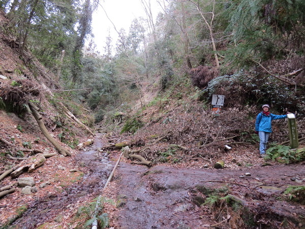 這一段山徑狹小,木塊散亂,加上今天較暖,融雪泥濘,一度懷疑是不是走錯了,前方小柵門提醒豐水期禁止前行應該就是因為這一段路!