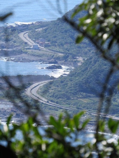 累了就停下來,回頭欣賞風景~透過樹縫觀賞海岸公路