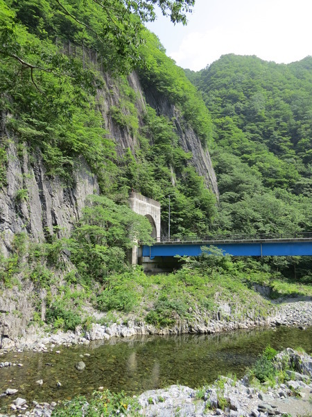 藍色的「尻(ㄎㄠ)跳橋」跨越「久慈川」的,進入穿越「鏡岩」的隧道中。