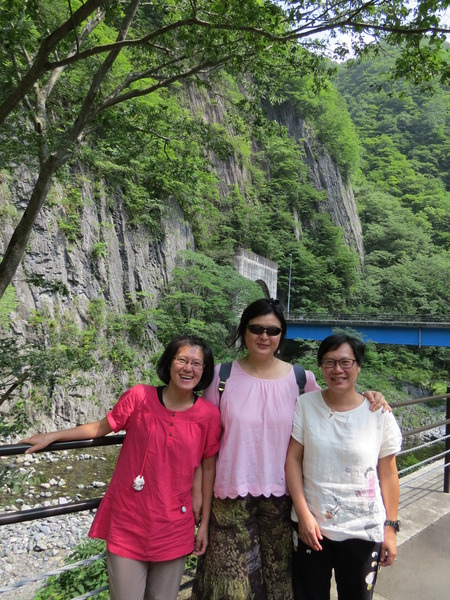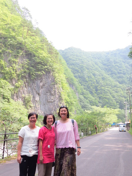 「鏡岩園地遊步道」是舊馬路規劃的,雖然設有路障禁止車輛進入,但是日本人也不是全都守法。我們很後悔沒帶瓶子過來裝「不老泉」,看到有車子違規駛入步道,有人提議開車過來裝水,立刻遭到其他三人鄙棄圍剿,走回車上,就此離開「久慈溪谷」。