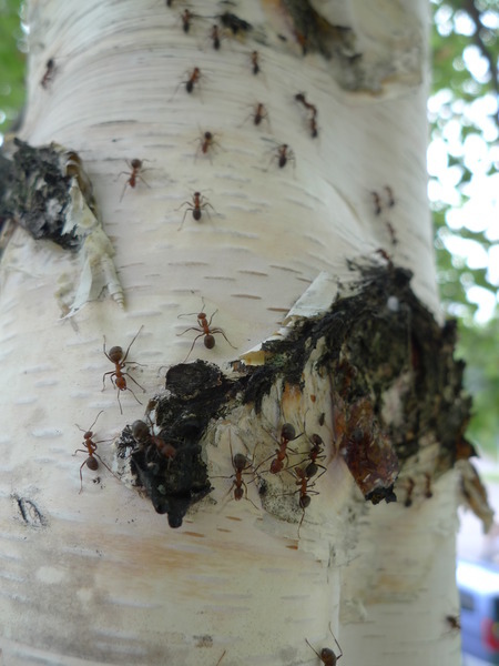 白色樹皮上好多螞蟻聚集,樹汁很甜嗎?