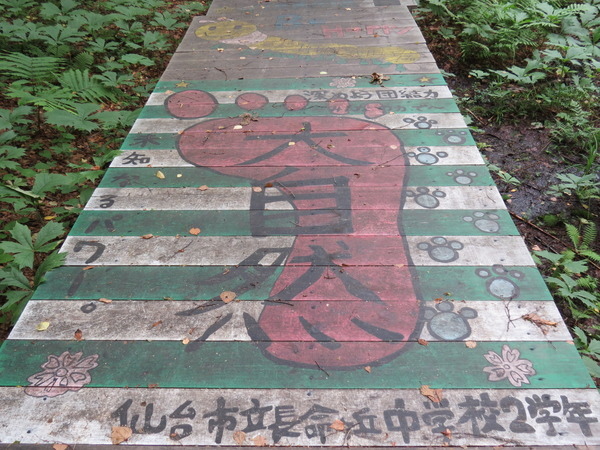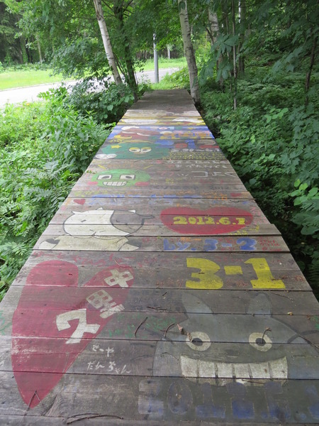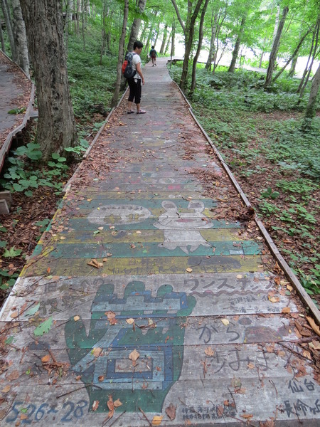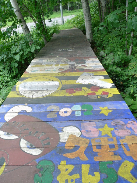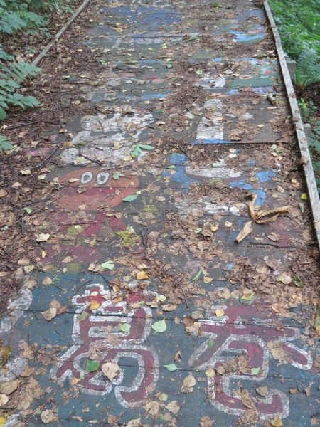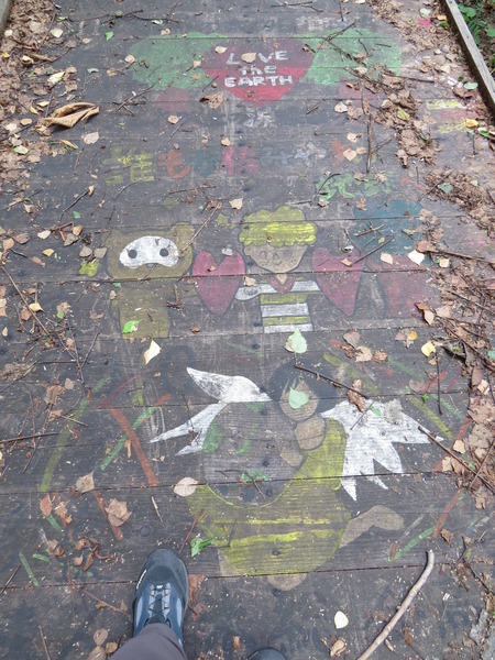 發現木棧道上可愛的彩繪,雖然被腐朽的落葉所遮蓋,歲月的流逝而模糊,這一小段仍然看得出來曾經是畫著麵包超人的故事。