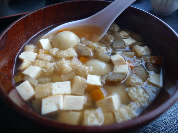 久慈特產:MAMEBU(500円)~牛蒡、紅蘿蔔、白蘿蔔、油豆腐及田樂豆腐等煮成的清湯配上黑砂糖內餡的小湯圓,湯是鹹的,湯圓是甜的,感覺搭起來應該很怪,實際上並不難吃,但也說不上好吃,很特別,可以嚐看看。