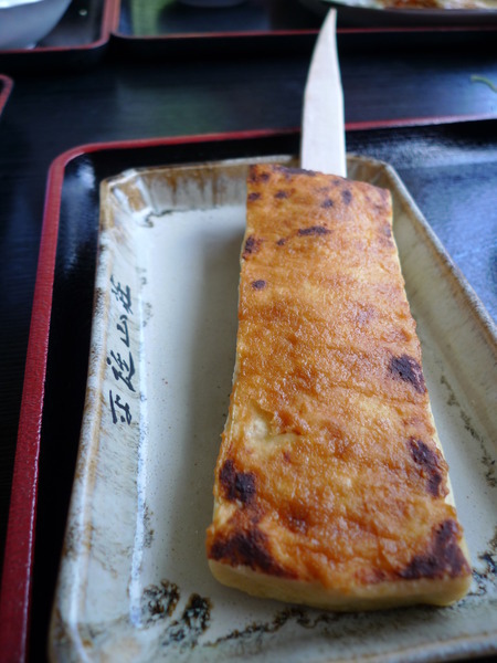 田樂豆腐(150円/串)~抹上味噌的烤豆腐,普通但很實在,特別的是插在豆腐上的木叉子,很像一把小刀。