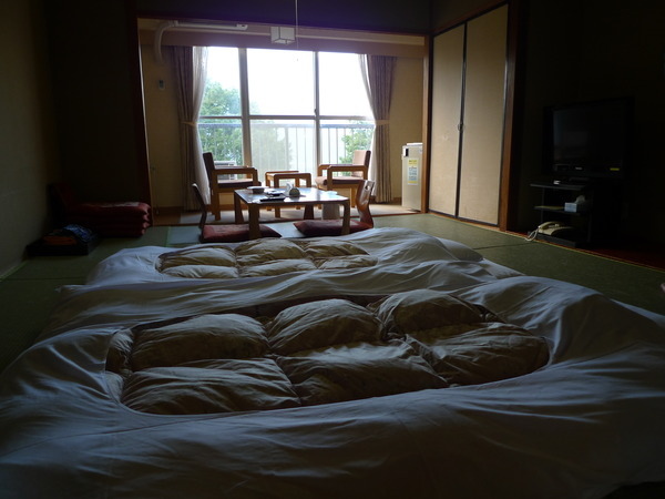 我們住的是面「八幡平」一側的「和室房」,附浴廁、陽台。一開門就聞到榻榻米的藺草香(+淡淡霉味),已先幫我們鋪好床了。