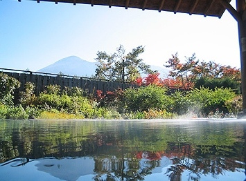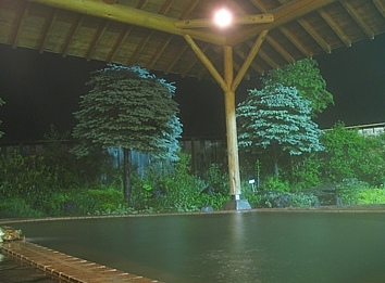 白天的「露天溫泉」還可以展望「岩手山」,但是我們只看到昏暗的夜色。