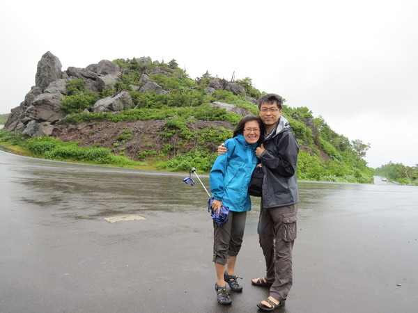 展望台對面就是「源太岩」~我們冒風雨下車,風強雨大,氣溫驟降,我們厚重衣服全都穿上還是覺得冷,雨傘被吹開花,快閃拍照,落荒而逃。