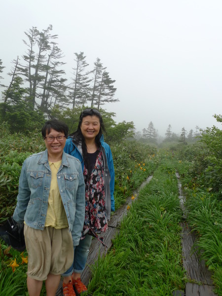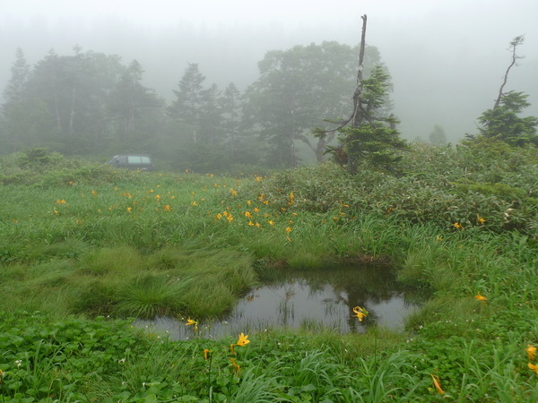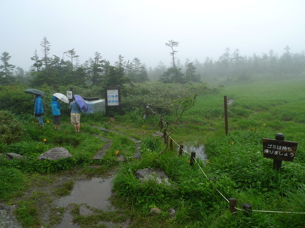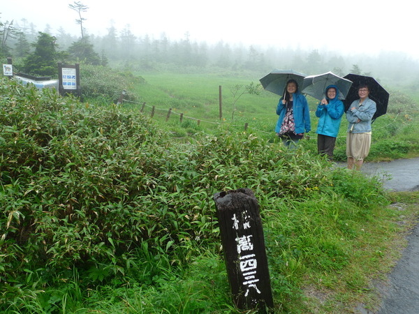 回到車上,繼續往上開,雨好大,霧好濃,幾乎看不清景物。朦朧中,發現路邊停了很多車,正七嘴八舌討論這是哪裡,已經看到「八幡平山頂休憩所」,「八幡平登山口」就在對面,難怪路上有人撐傘步行。