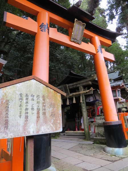 這裡是祭拜「秦氏」祖先的地方(稻荷神=秦氏氏神,見百度百科伏見稻荷大社),所以稱為「長者社」,「御劍社」供著又名「雷石」的「劍石」,沿著石階爬到最高點就能看見。