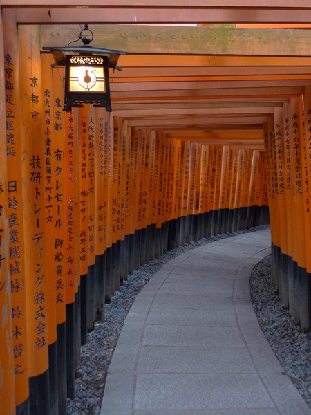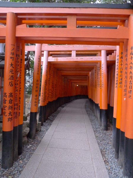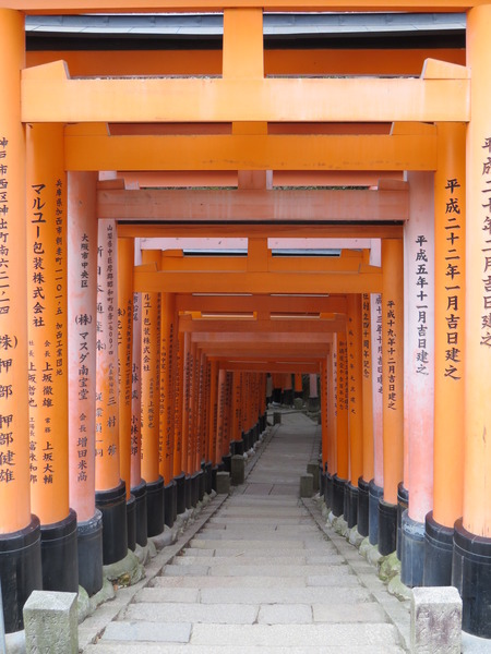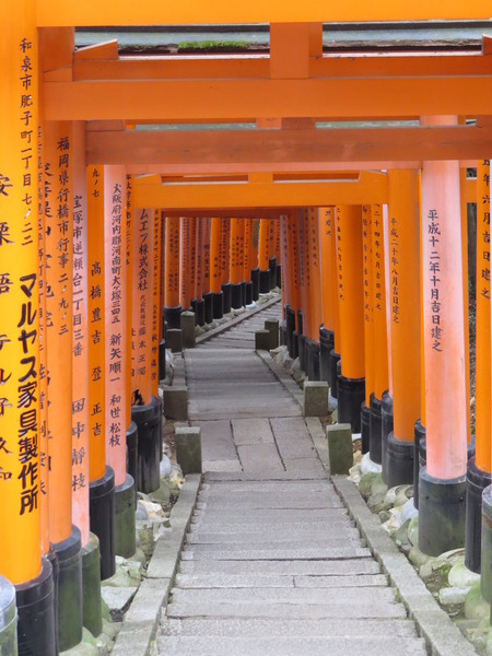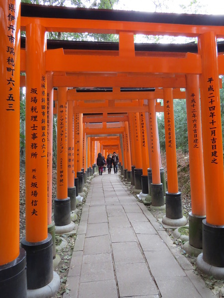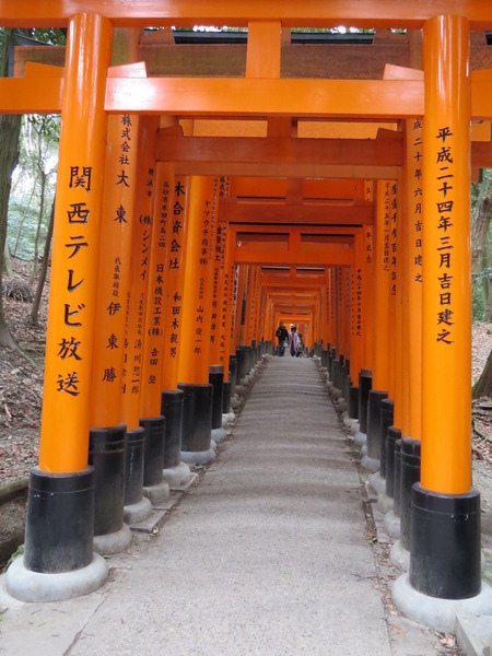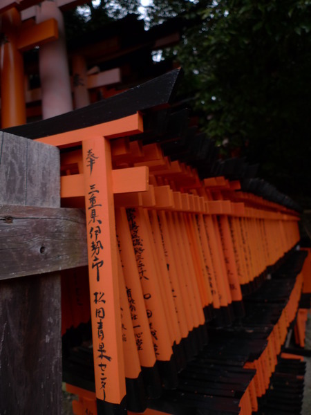 繼續下山~我們被雜誌上的「鳥居隧道」照片吸引到這裡來,也想拍出一樣美的照片,有字的正面比較好呢?