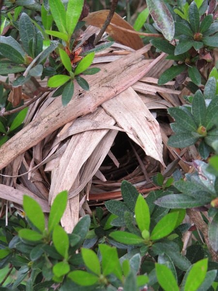 某株杜鵑叢中發現這個竹籜棄巢,這個鳥巢引起融融碎碎念:原來是某年二姐把庭院櫻花樹上的鳥蛋弄破……,融融嘟著嘴抱怨不已,她耿耿於懷,我們覺得好好笑。