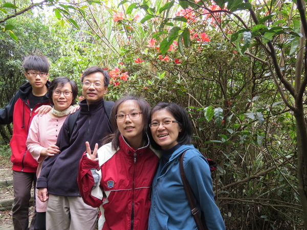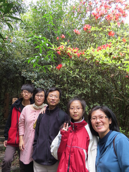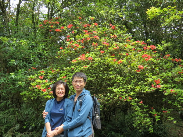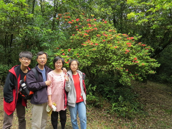 三角點旁一棵綻紅的「金毛杜鵑」,趕快一起合照。(融融身體好像痊癒了!)