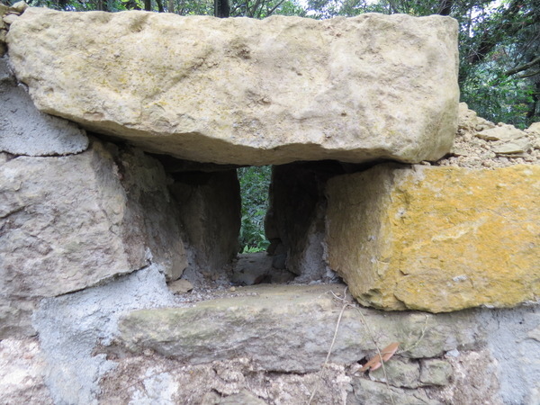 13:20 「石寮遺址」是鄰近日軍隘勇線的防禦駐站,外牆用砂岩和卵石以「人字型」堆疊,大門外有一道厚石牆屏障,然後必須經過兩道有轉折的70公分入口才能進入。