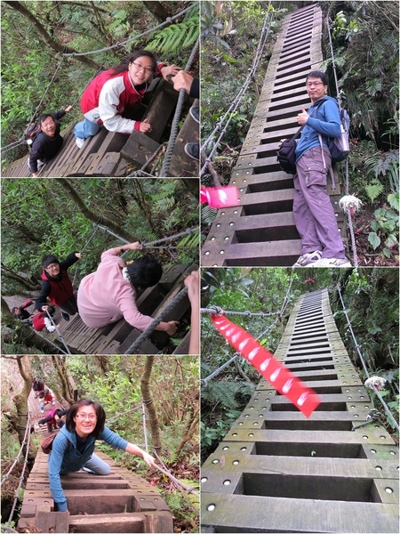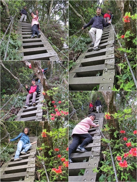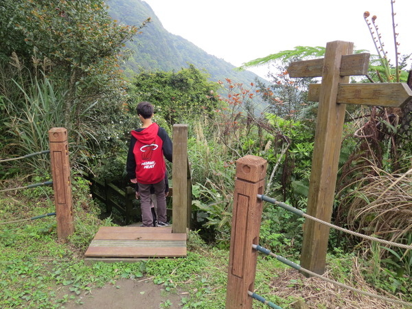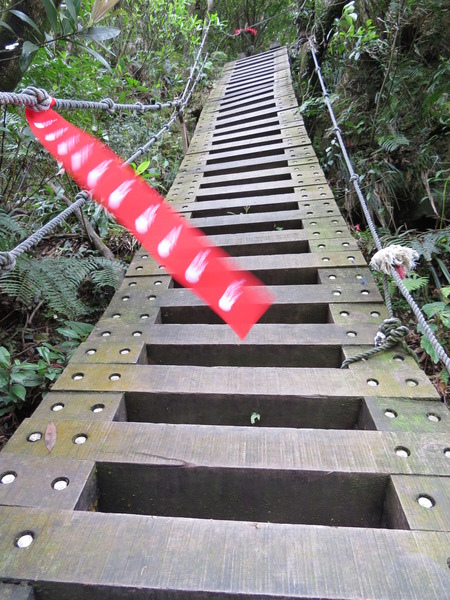 跨過三角點往山邊走,有瞭望平台,走在這上面要格外小心,有些地方已有破洞,有些地方站上面覺得木頭快斷了,有點危險。