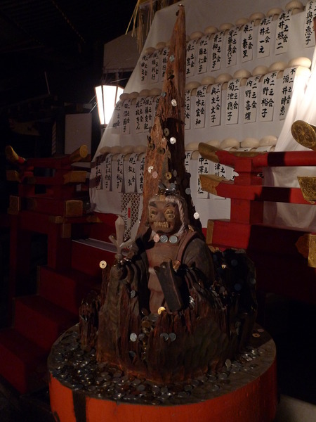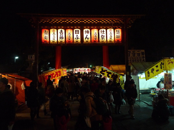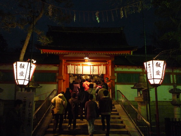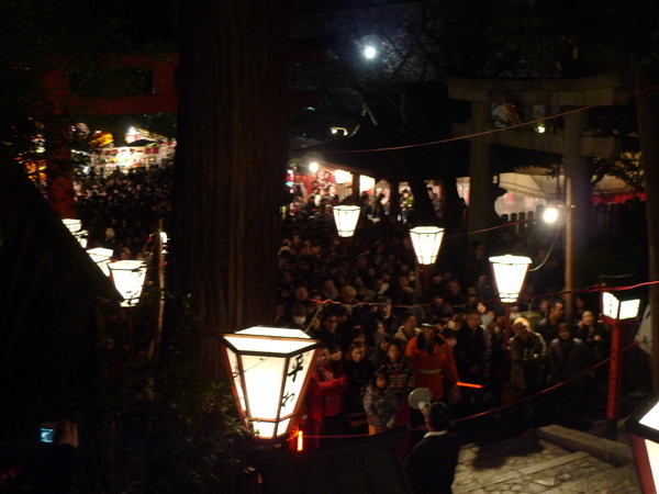 「吉田神社」位在京都東北方的「吉田山」山腰上,我們要爬樓梯上山的路上,聽到悠悠的笛聲,衝到時,鬼已消失無蹤,只看到擁擠的人潮和綿延無盡頭的攤販,才17:55啊!