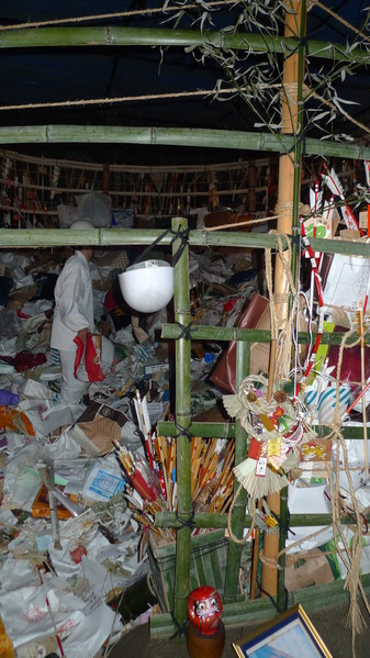 大元宮參拜完畢,本打算下山離開,道路卻被工作人員拉線封鎖,只好跟著導引,來到高五公尺的大火爐旁邊,和房間一樣大的火爐裡面堆滿了去年的祭品、繪馬......,陸續不斷投入中。