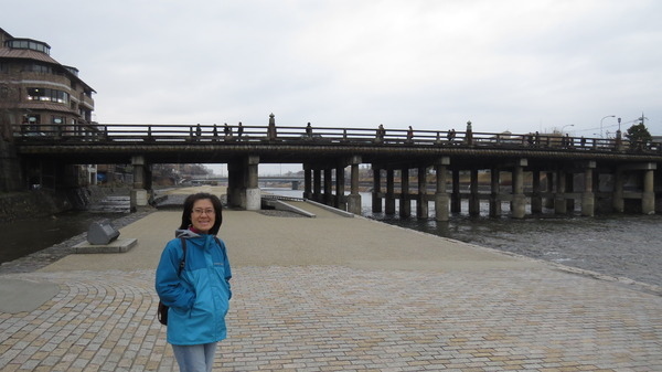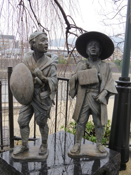 橋邊立的兩尊銅像,是江戶後期浮世繪家「十返舍一九」的繪本「東海道中膝栗毛」中的兩位主角~彌次郎兵衛和喜多,書中描繪他們沿著「東海道」從江戶(東京)前往伊勢、京都、大阪途中的種種趣事。「栗毛」指栗色馬;「膝栗毛」表示用自己的膝蓋代替馬,「徒步旅行」的意思。我們沒看過繪本,也不知道故事內容,但雕像有感受到「鄉巴佬進城」的滑稽模樣。