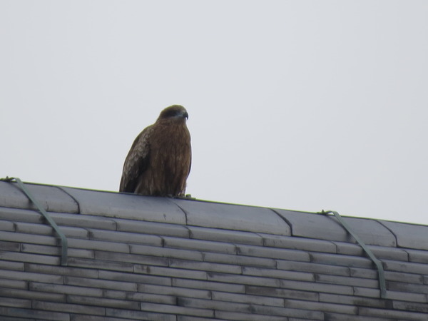第三天下午為了參加「八坂神社」下午三點的舞妓表演,我們吃飽逛街之後,在「四条通」東行往祇園方向前進,聽到老鷹的鳴聲,仰頭尋找,發現牠就停在店家的屋頂上。