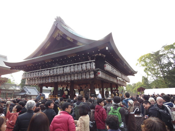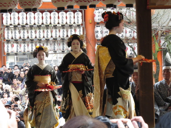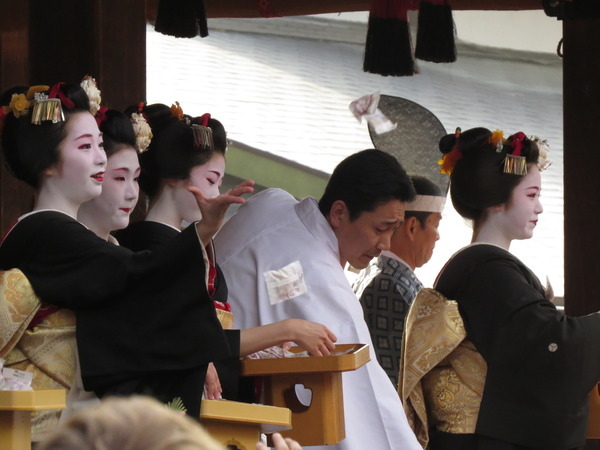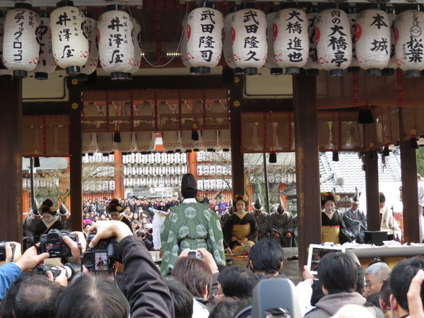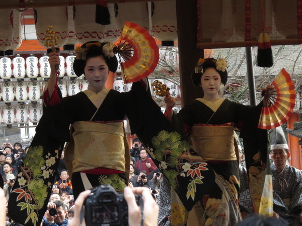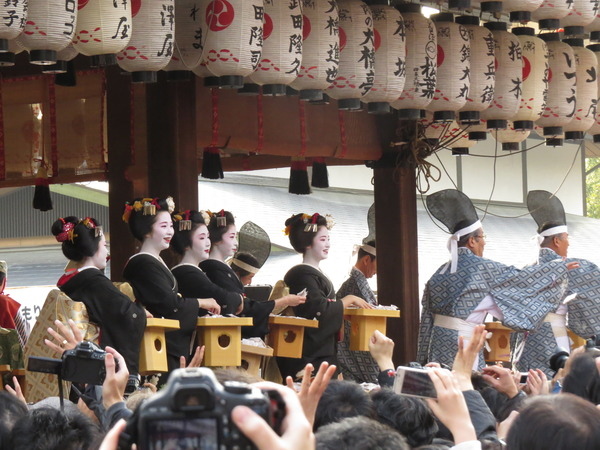 15:00是「宮川町奉納舞踊」,我們14:50來到「舞殿」前,四面已圍滿了人,因為是「奉納」,當然是表演給神明看的,所以「站在本殿前,面向舞殿」才能看到正面,於是我們努力的擠進去,放眼四周都是滿滿的人頭與長鏡頭相機。