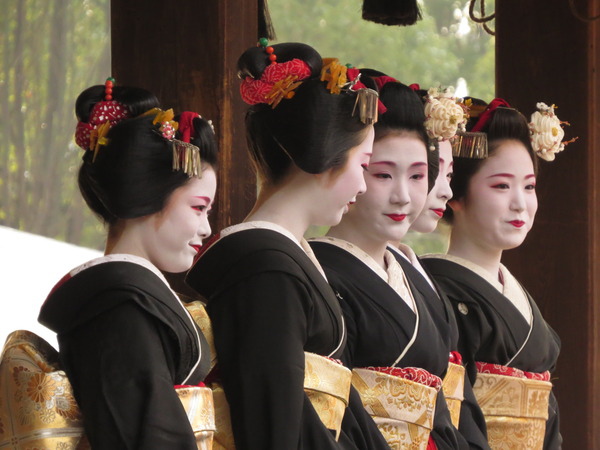 2.裝扮:不能用假髻,只能以自己的長髮梳髻;必須按照月份配戴髮簪(一月松竹梅,二月梅花,三月油菜花......);和服質料一定要上等,多半是「京友禪」;「舞妓」袖長及膝,顯出少女的婉逸多姿;「藝妓」衣袖變短,顯得比較成熟。