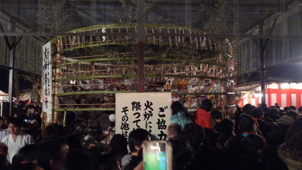 2/3晚上11:00的「火爐祭」是另一高潮,信徒將前一年的御守、避邪物之類的物品都拿來燒掉,我們在「追儺ㄋㄨㄛˊ」時經過,看到火爐比房子還大,高達五公尺,可以想像火勢之壯觀。但是年紀大了,不宜熬夜,所以沒有親眼看見熊熊烈火照耀下的吉田神社。