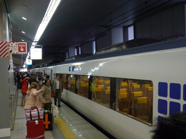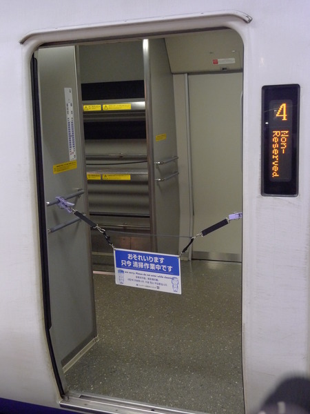 才十一點,列車已停在月台上,到「自由席」車廂所在的位置排隊,門上掛著清潔中的牌子,