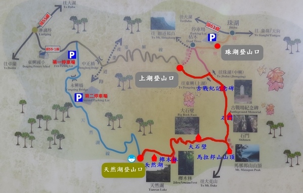1.天然湖登山口~東興村南線:遊客最多,登山路線最遠