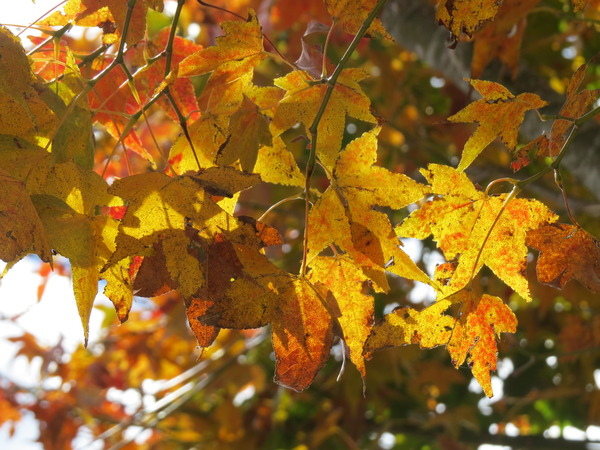 平台邊緣有幾棵不高的楓葉,楓葉雖然不紅,但是陽光正好小小露臉,有陽光就美多了!