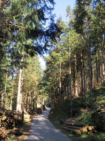 月球石之後的大坪林道是整齊的柳杉造林,路邊整齊堆放著好多木材,車子很少,沿著林道散步非常舒服。