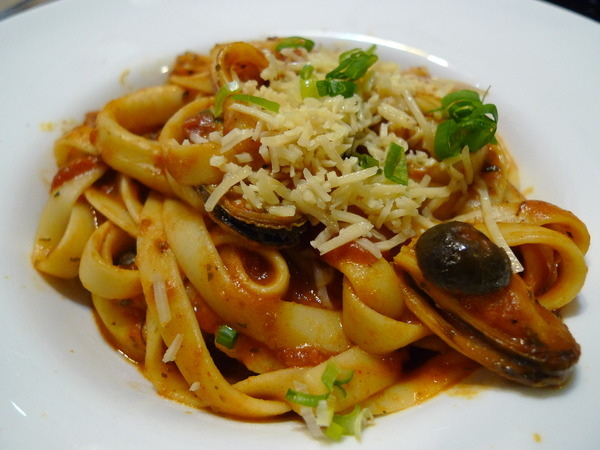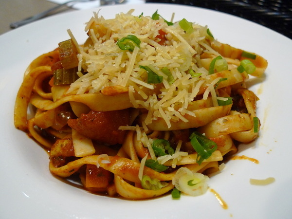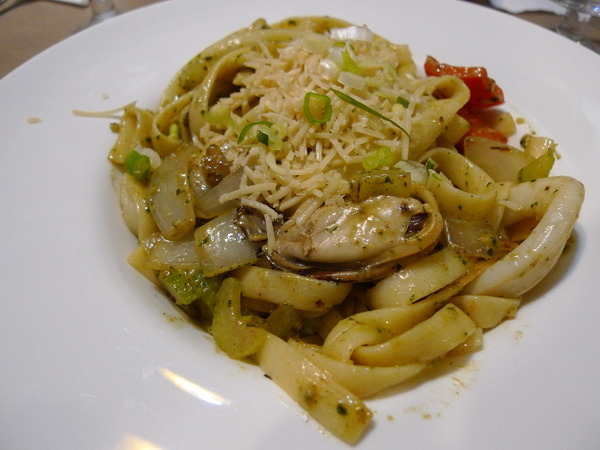 有酒香的醬料非常特別,大家一致喜愛。這裡的麵條是主廚親手做的,有粄條的寬扁外型,還有手擀麵的嚼勁,和平常吃到的義大利麵很不一樣,不禁疑問:紐西蘭的義大利麵都是用這種麵嗎?沒有人知道答案。我們可能被傳統義大利麵制約太久,有一點不太習慣這種麵條,吃起來覺得不像義大利麵。