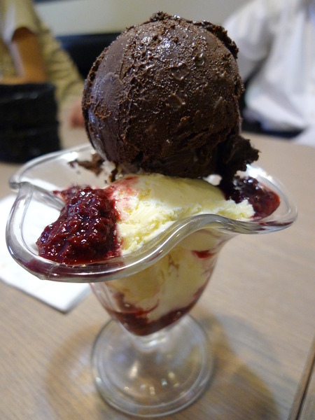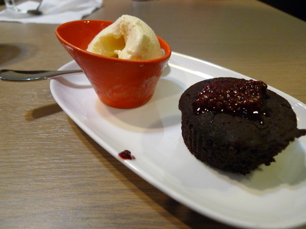 巧克力香濃又不會甜膩,長長的湯匙垂直下挖,巧克力+香草冰淇淋+酸酸的蔓越莓=幸福的滋味,視覺和味蕾同時滿足,這裡的甜點真的很道地,給他按個讚!