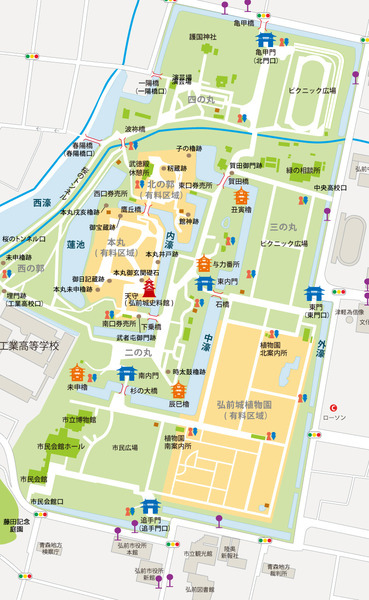 弘前公園佔地廣闊,本來預計是在追手門前的「市立觀光館」租腳踏車,但是陰雨不斷,只好散步遊城,如果天氣許可,還是騎單車比較輕鬆又愜意。(點此看大圖)