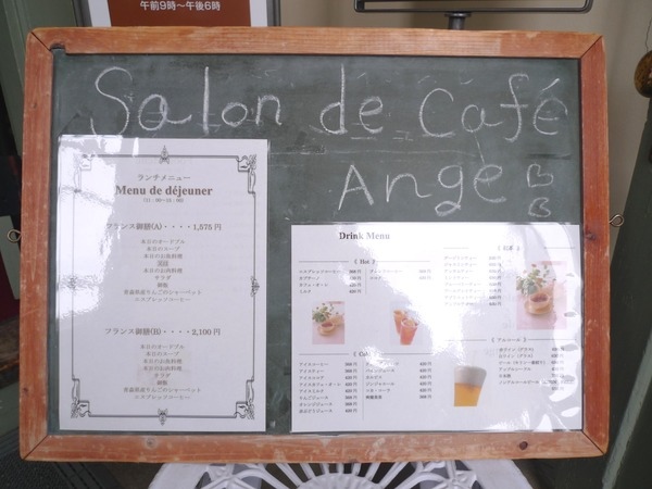 這家咖啡廳的名字是「Salon de cafe Ange」,玄關就有菜單。