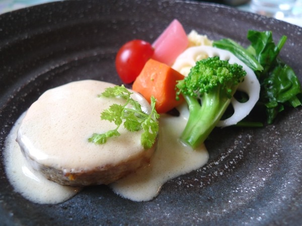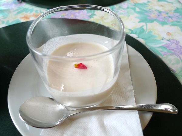 湯品:透明的玻璃杯內盛裝著牛奶色的冷湯,紅玫瑰花瓣漂浮其上,有別於一般熱湯的口感,味道很清雅。