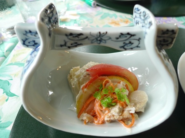 前菜:魚肉、洋芋與胡蘿蔔絲攪拌,加上番茄切片與柳橙片,盛裝在造型很特別的食器內,無論視覺或是味覺都是一種享受。