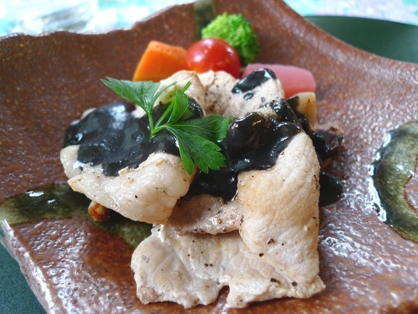 肉料理:二姐一吃就說:「這是里肌肉。」馬上有人接話:「這是豬肉,不是雞肉。」豈知此「肌」非彼「雞」,立刻被三人圍攻嘲笑!黑色醬汁應該是墨魚汁,濃郁香醇,彌補了稍嫌乾澀的肉質。