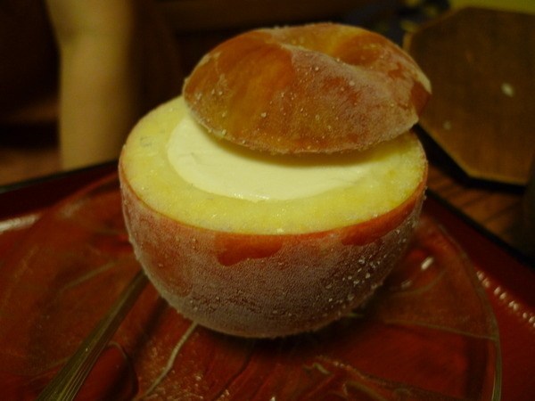 「蘋果冰」~整顆冰凍的蘋果,中間是蘋果雪酪,用湯匙刮著果肉,配著雪酪一起吃,吃的過程有一點辛苦,但是我們吃到只剩下果皮,因為實在是太美味了。