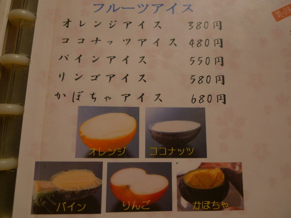 雖然大家都吃得很飽了,但是還是想嚐看看這一頁的「水果冰」是什麼滋味,有柳橙、椰子、鳳梨、蘋果、南瓜,五種口味。
