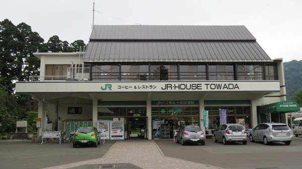 我們住的民宿就在十和田湖最熱鬧的「休屋」路口,所以環湖的第一站就先開車到這裡,開進休屋後發現這裡很商業化,連停車都要收錢,我們並不想搭船遊湖,所以繞一小圈後在這家公車休息站暫時免費停車,到裡面隨便逛逛。