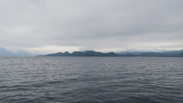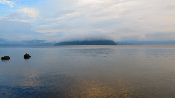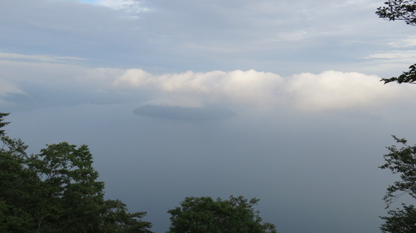 中間看起來像小島的地方,就是最晚形成的「御倉山」,其實左邊還連接著「御倉半島」,雲層不只在御倉山上繚繞,現在仍然霧鎖「西湖」一側。