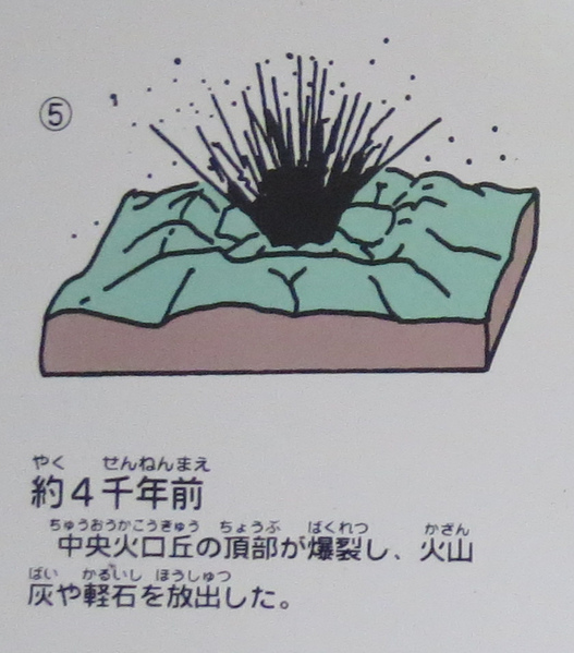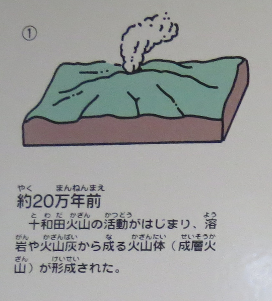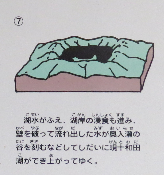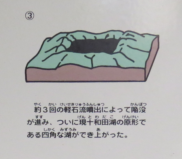 展望台樓梯旁有圖解說明「十和田湖」的形成過程,不懂日文的我,當成漫畫來看: