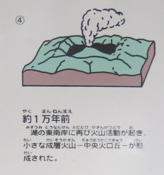 (4) 一萬年前:湖的東南岸(中山半島和御倉半島之間)又火山爆發,湖的中央隆起另一座火山。