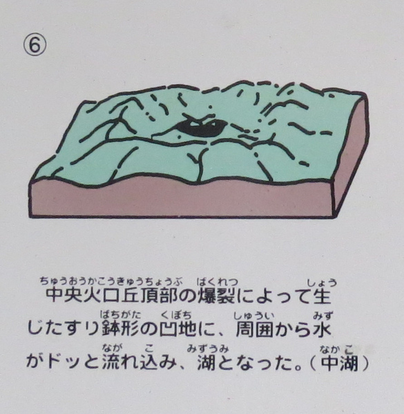 (6) 中央的火山口頂部爆裂,形成缽狀凹陷,周圍的湖水流入,形成「中湖」。(第二層破火山口,難怪都說十和田湖是「雙重破火口湖」)