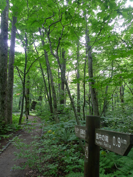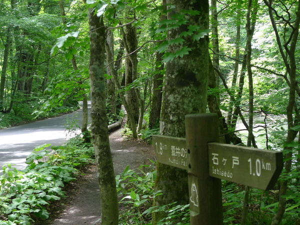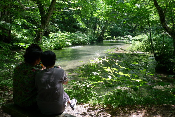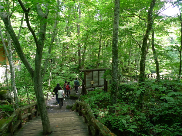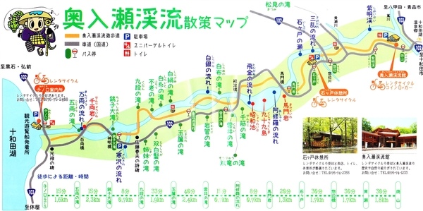 閒晃時,導引停車的老先生給了棕熊一張地圖,兩人用地圖聊天,老人家建議:如果時間有限,從「雲井之瀧」開始走就可。我們決定把今天都奉獻給美麗的奧入瀨溪,並不趕時間,所以仍決定從「石ヶ戶」開始走。